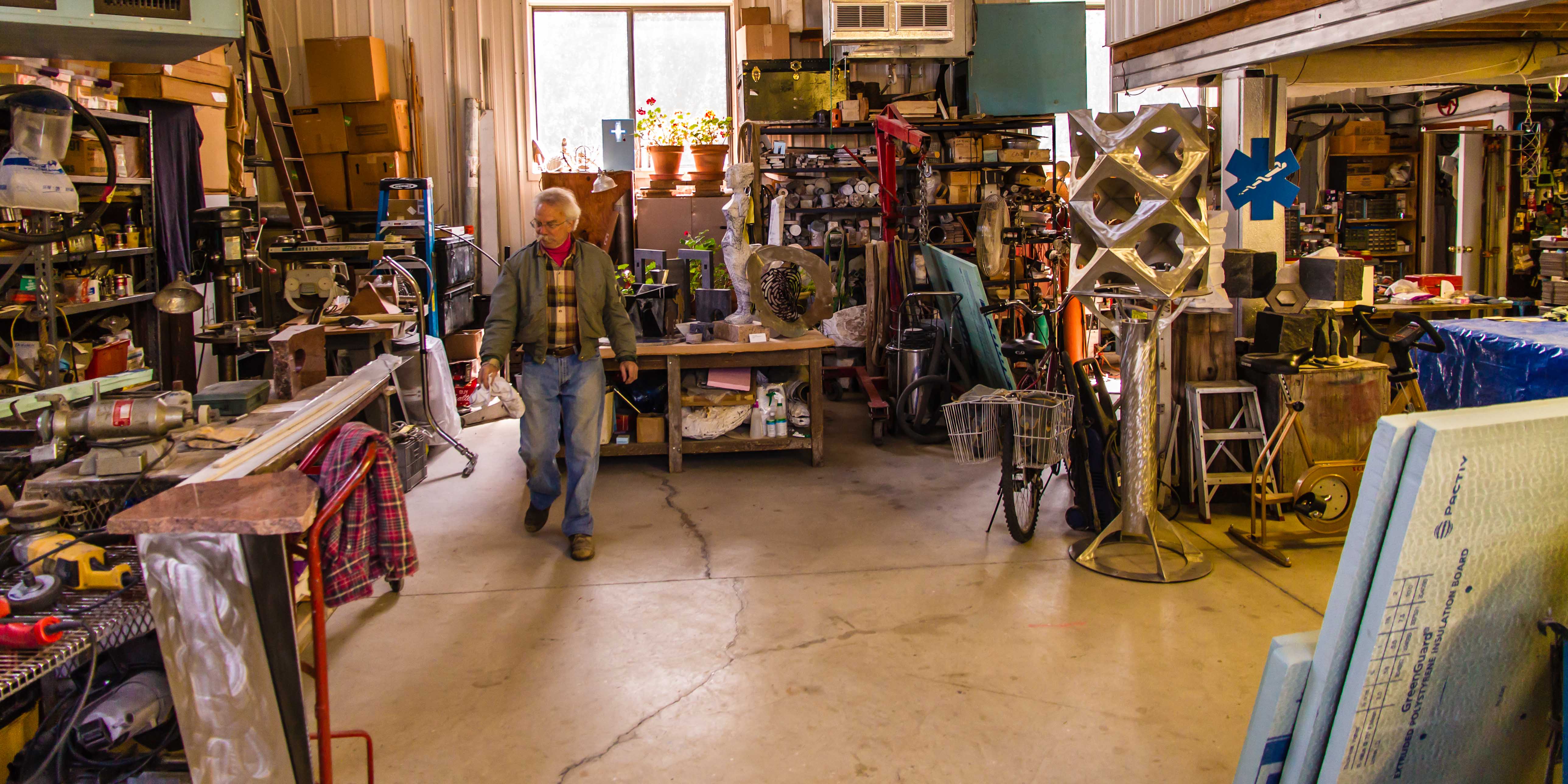Jon’s art is made from many materials – stainless steel, painted steel, brass, bronze, fiber optic light and more. Jon added even more materials to his sculptures after a year living in Italy and studying stone-working. Here are some of his stone inventory and stone working tools.