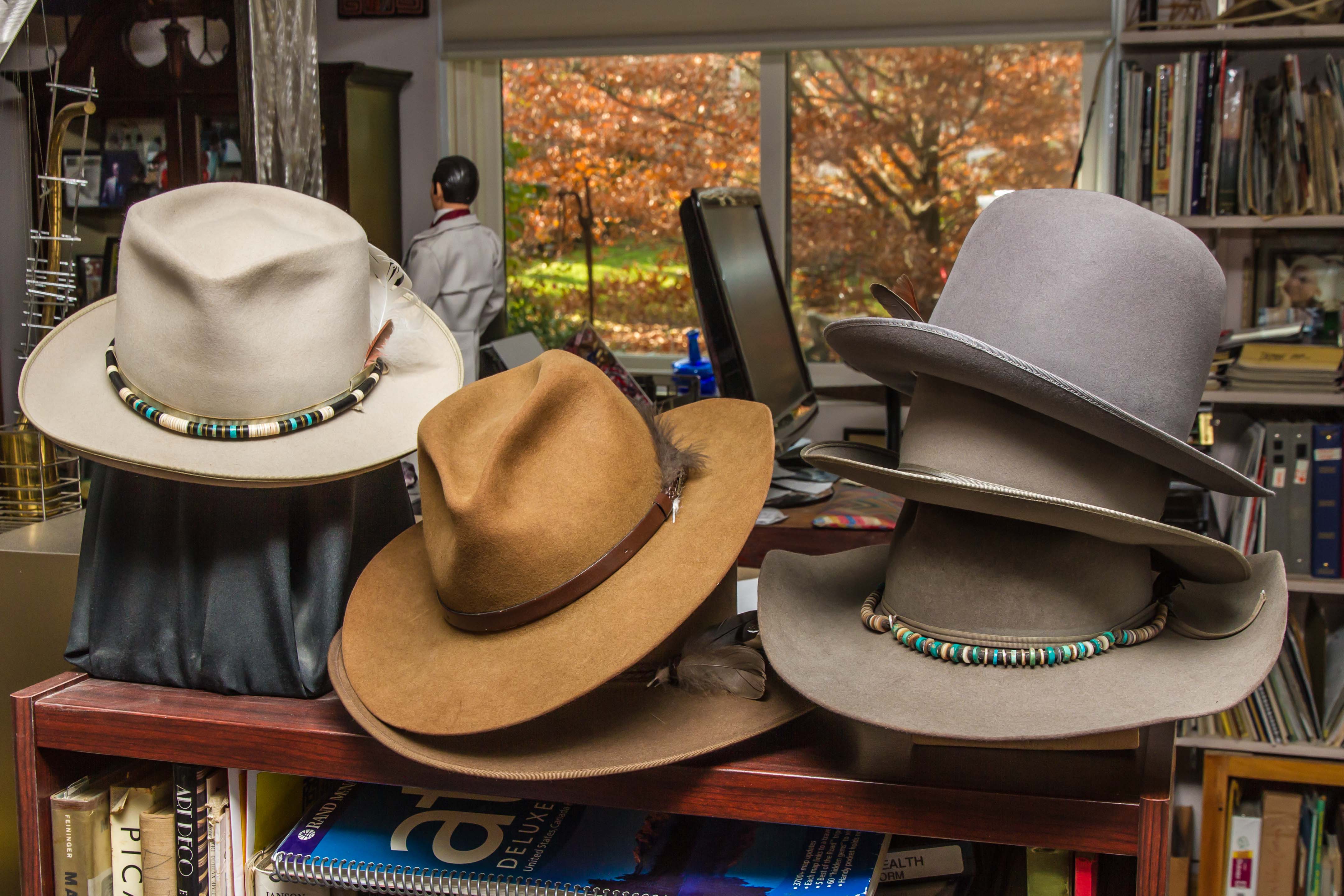 The office area is also filled with hats. As part of her doctoral research in costume history Jon’s wife and creative partner, Debbie Brush Henderson, put together a wide-ranging collection of hats. The hats have been exhibited in several art museums.