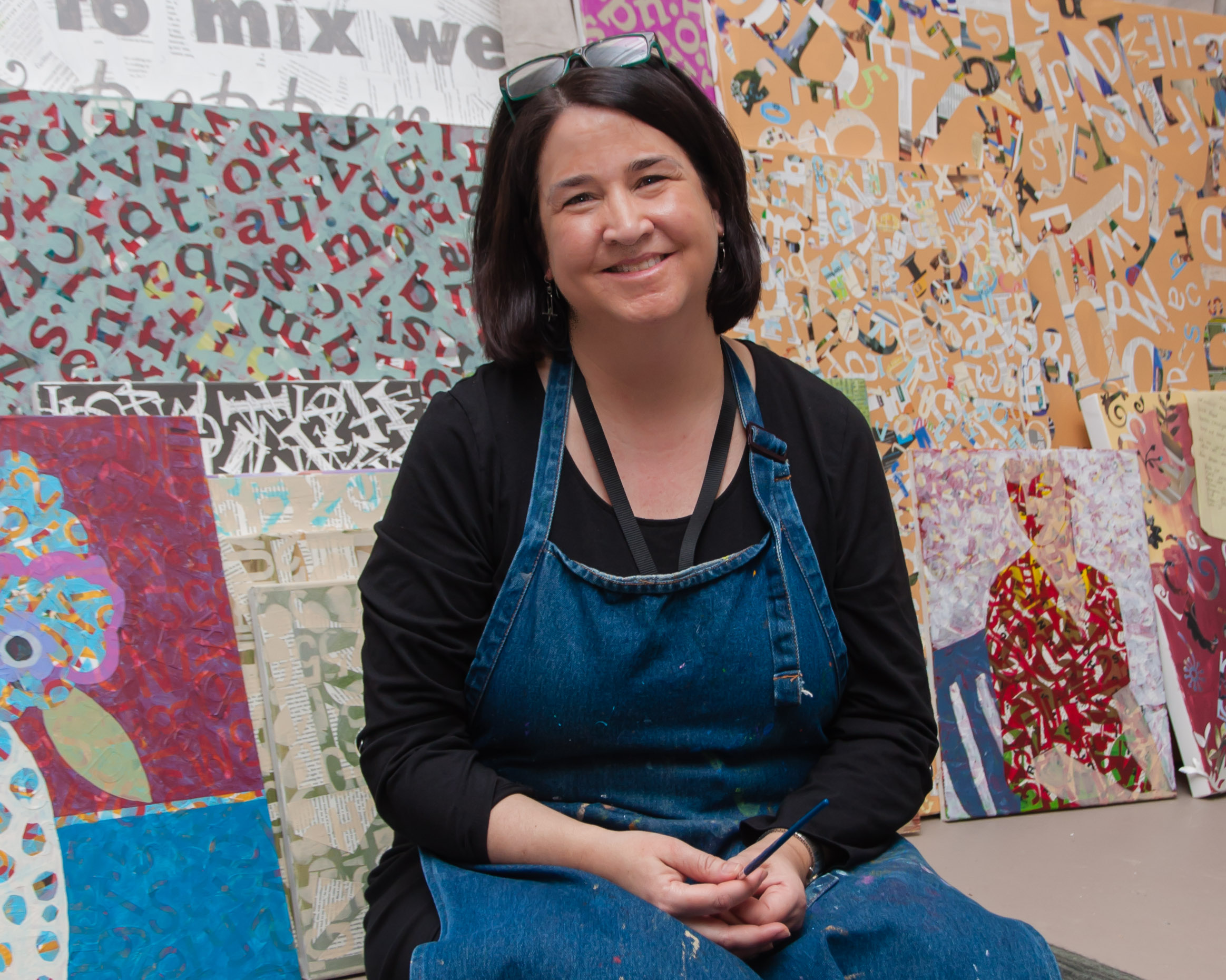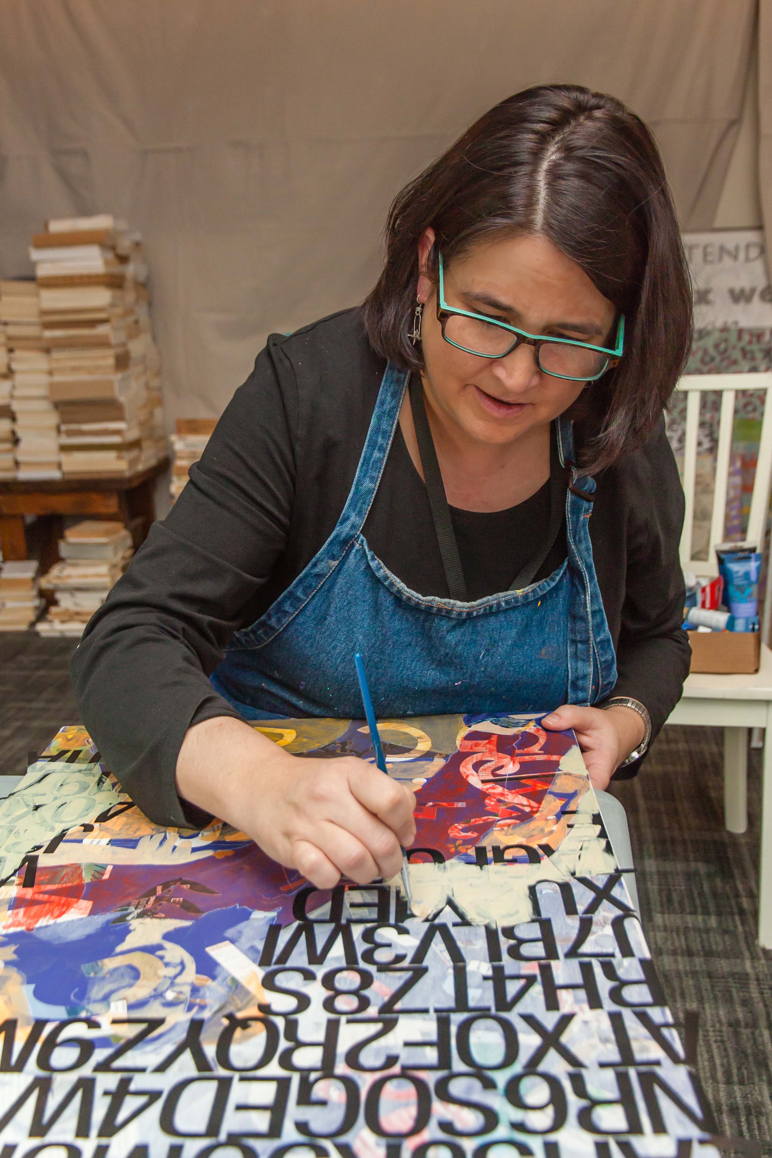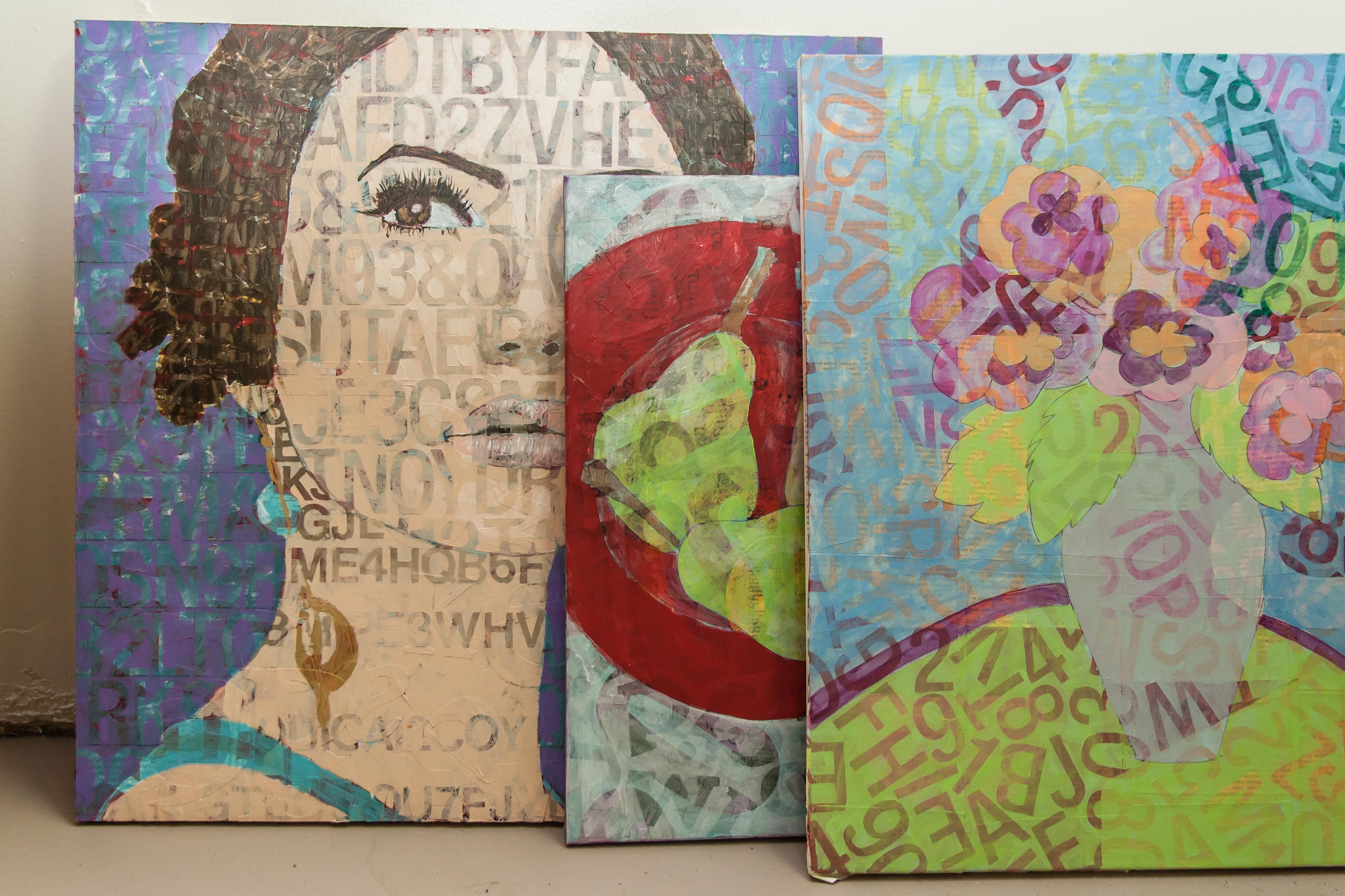 The paper is cut into all kinds of shapes. Many are cut in the form of letters. As much as possible, Amy matches the general subject matter of the paper and the subject matter of the paintings she creates.