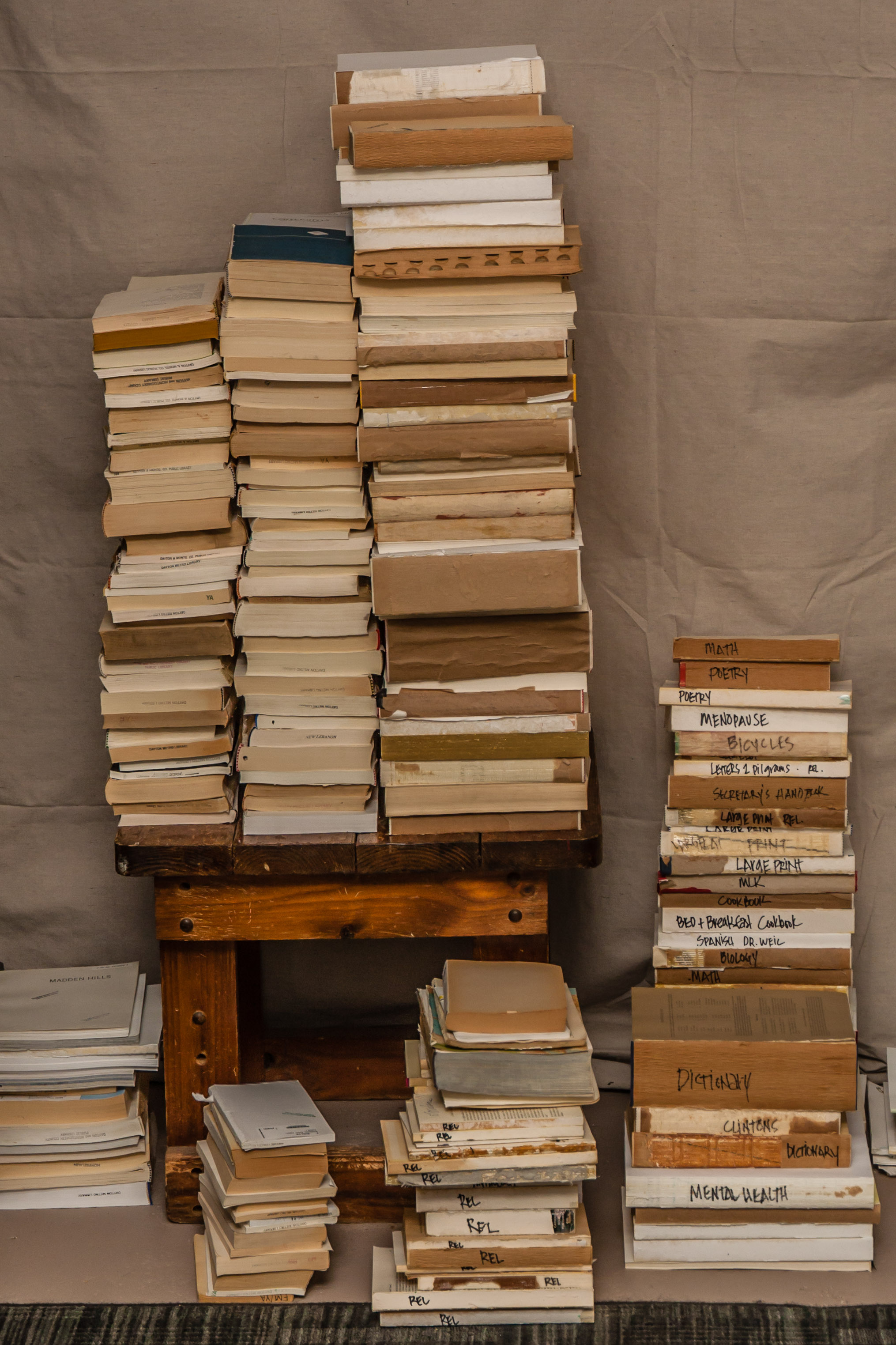 Amy’s art starts with her collection of paper. She has all types of papers, old maps, magazines and books. This stack of books is organized by subject. I saw books of poetry, math books, biology books and all kinds of travel books.