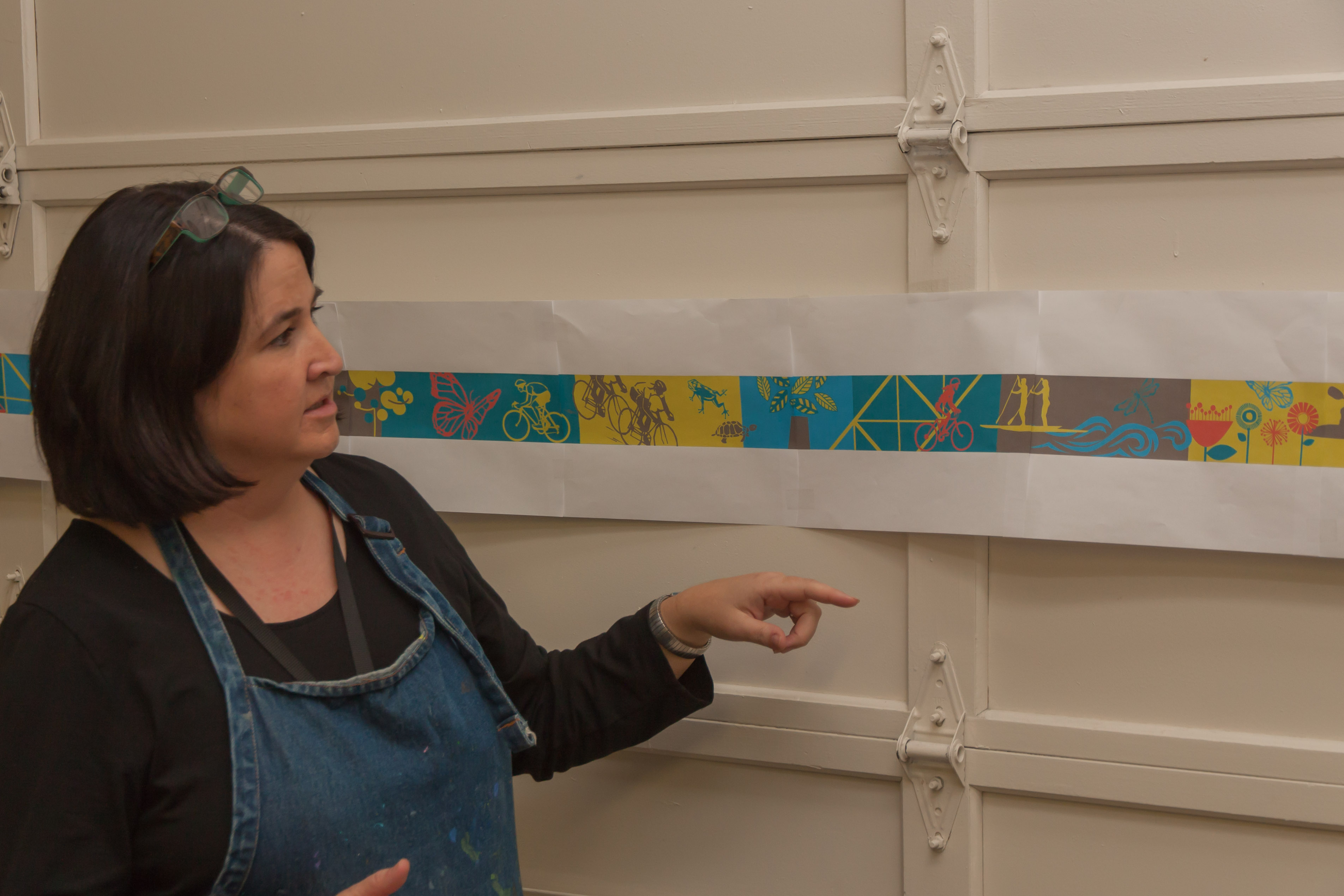 I noticed a long sheet of paper – actually many papers taped together – on the back wall of the studio. Amy explained that there was a competition to design a mural for the long concrete wall across the water from RiverScape MetroPark. She is a semi-finalist. Amy put this scale model of her initial mural proposal together to help her visualize how it would look to viewers.