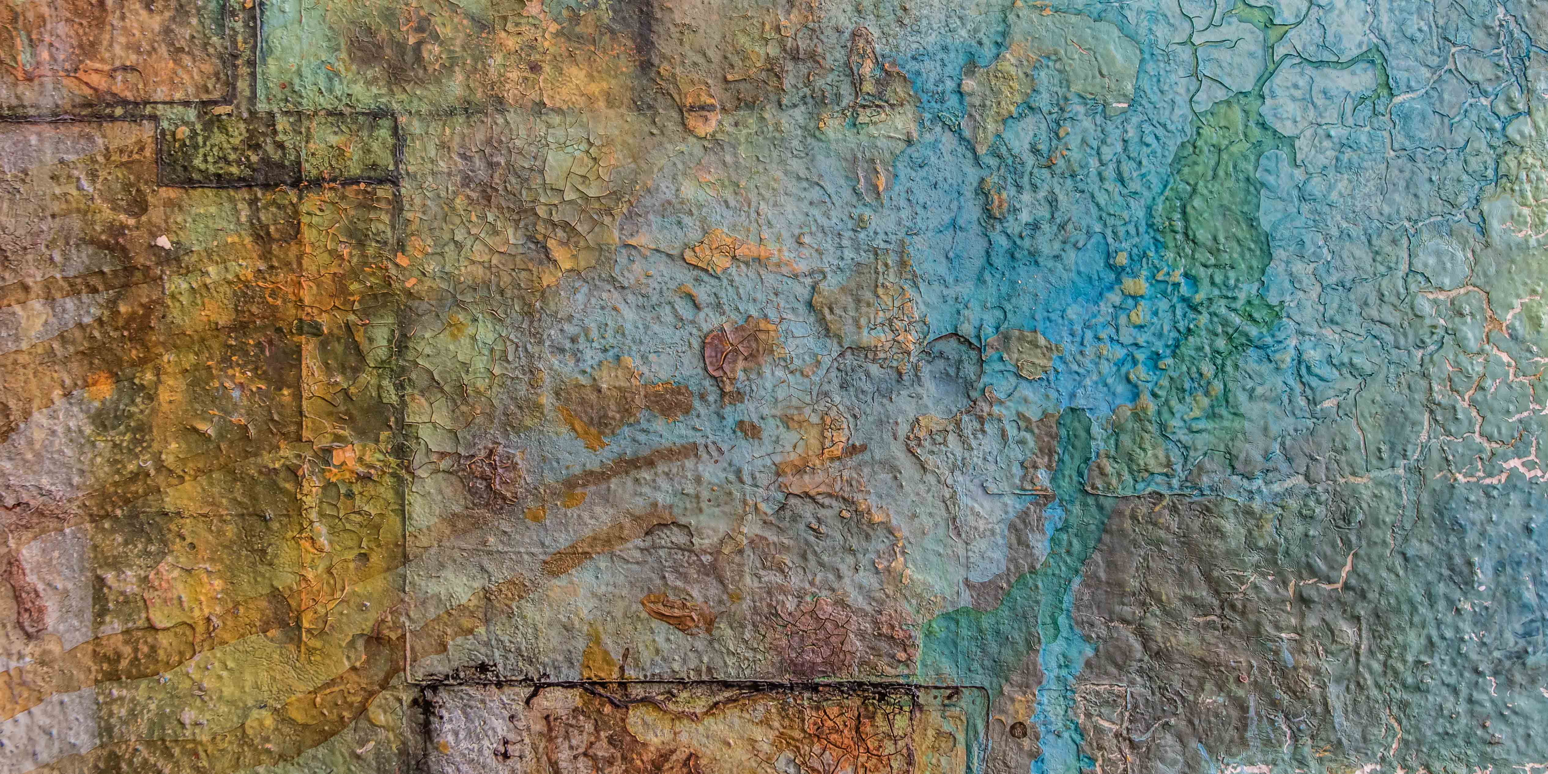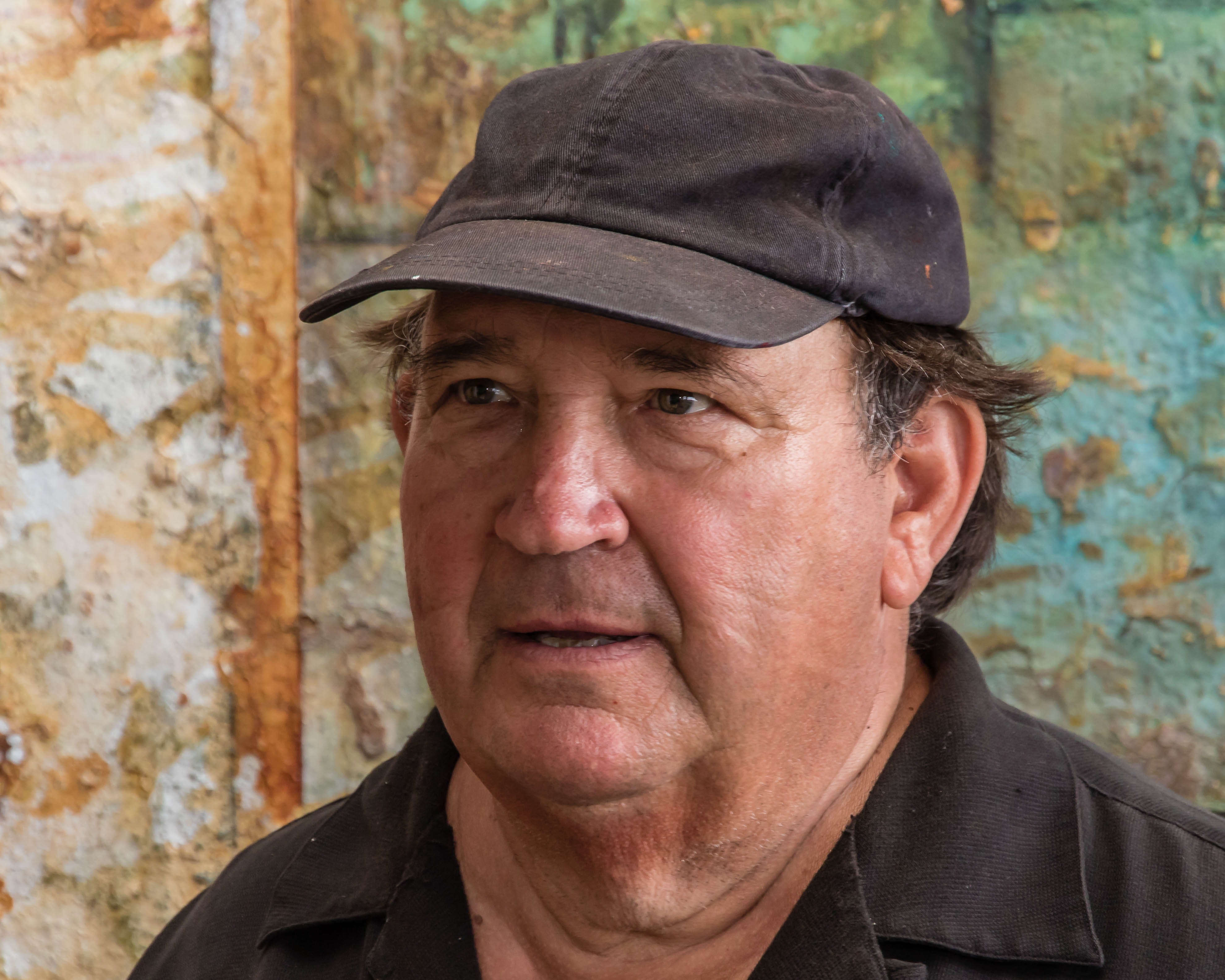 Mike’s process starts with sheets of steel – some already rusted and some rusted in the studio.  Next he may add other materials that create even more texture.  Finally he applies as many as 40 layers of acrylic paints to create the final work.