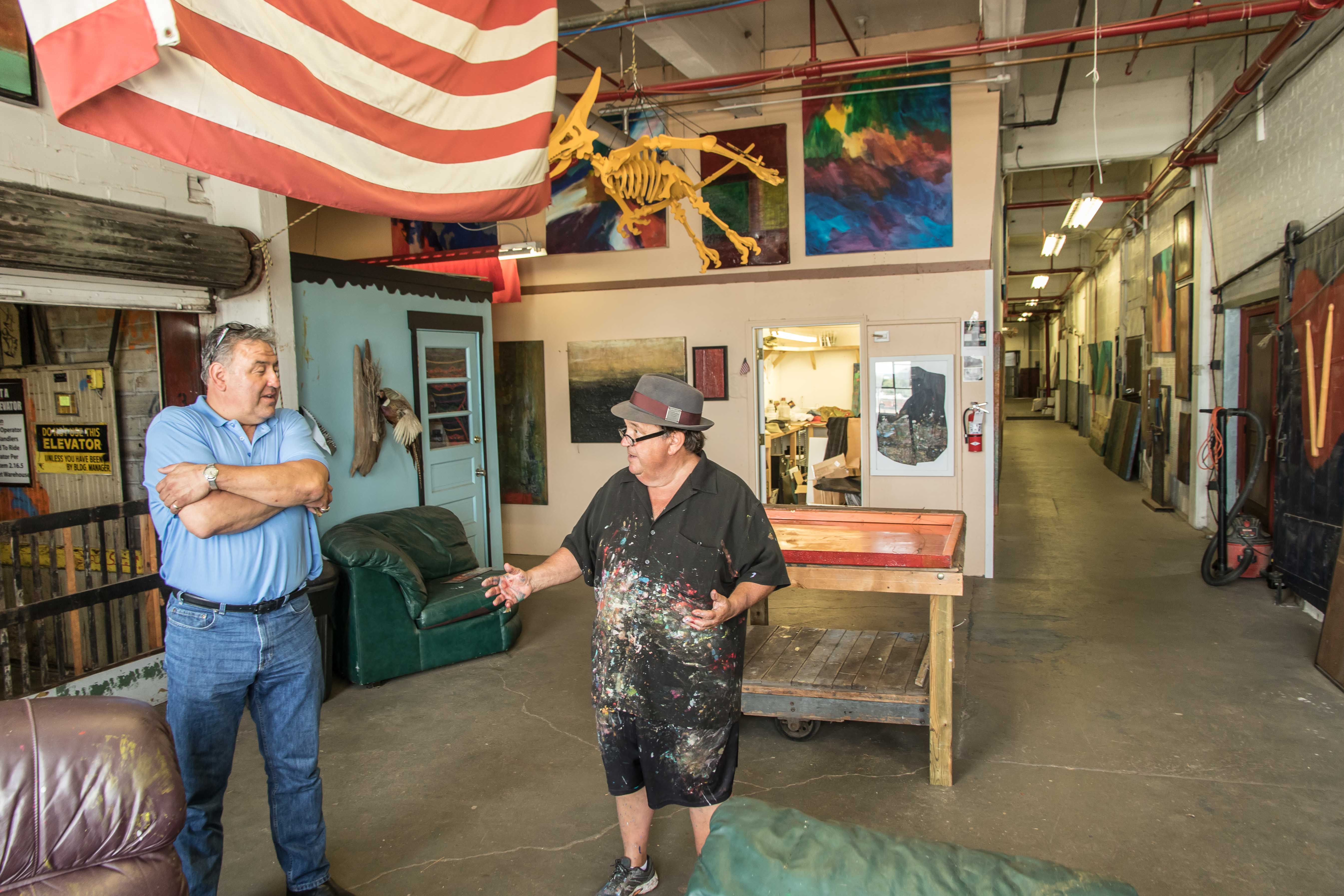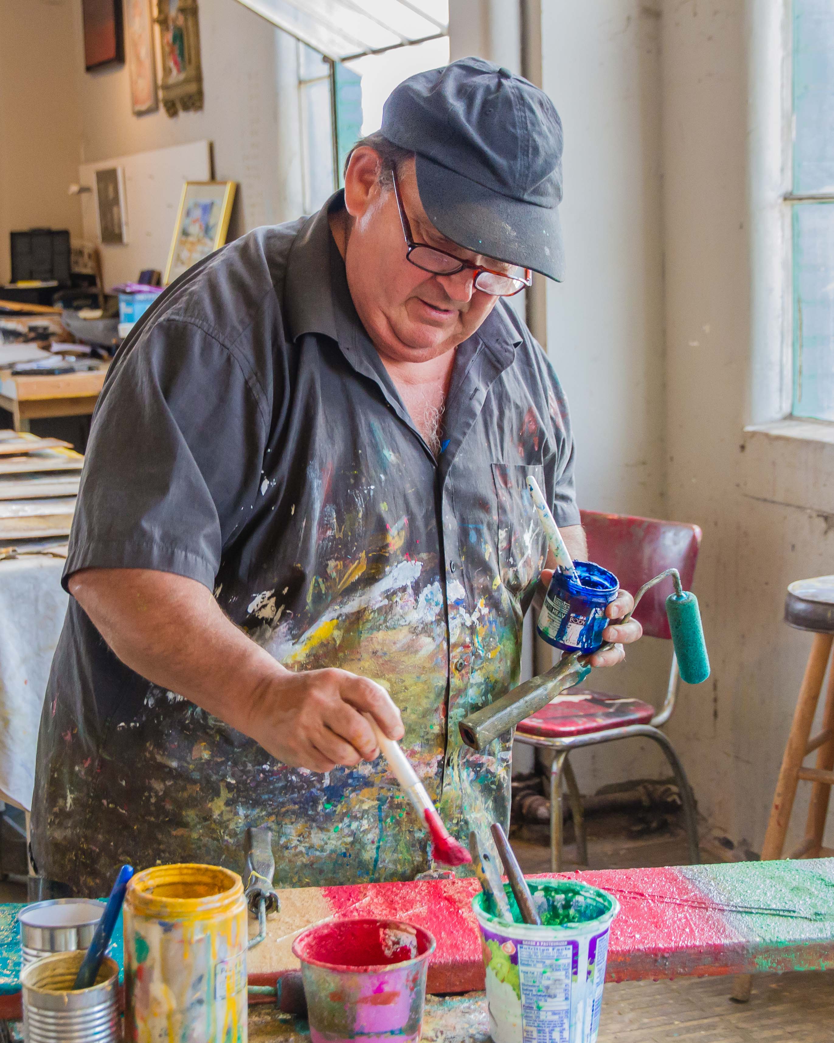 Mike Elsass may be Dayton’s most colorful artist, and he works in what is definitely Dayton’s most colorful studio.  Mike rents most of the top floor of one of the Front Street buildings.  His space includes a beautiful gallery, several large production rooms, plus space that he rents out to other artists.
