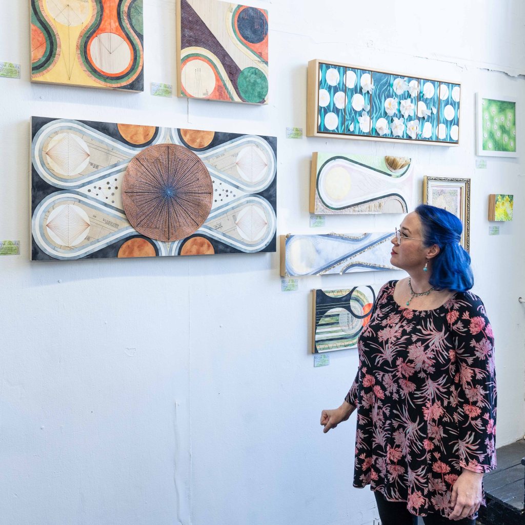 I first met artist Caitlin Cartwright at Dayton’s Front Street Buildings, on a night when more than three dozen studios and galleries were open to the public.  Caitlin was the featured artist in the Color of Energy Gallery, and her vibrant painting-drawing-collages were creating quite a stir.