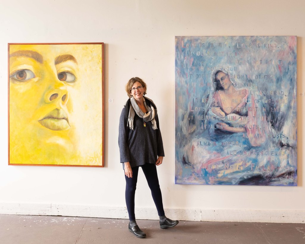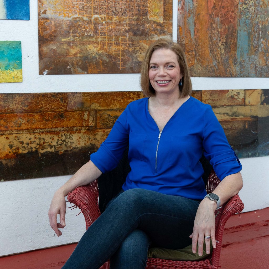 Elisha makes mixed-media art at Front Street, in her studio on the first floor of the 100 Building that she shares with Kate Santucci.  The first time I met Elisha she wasn’t making visual art.  She was singing with the Blue Heron Trio.  The group has been on hiatus since 2022 but you can still hear Elisha sing online.  I asked about her shift from making music to making her multi-media art.